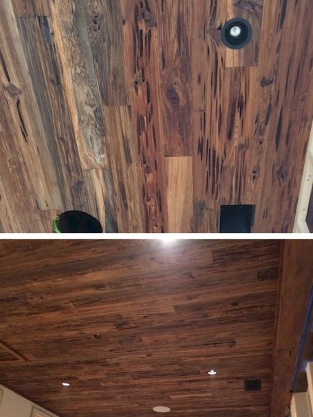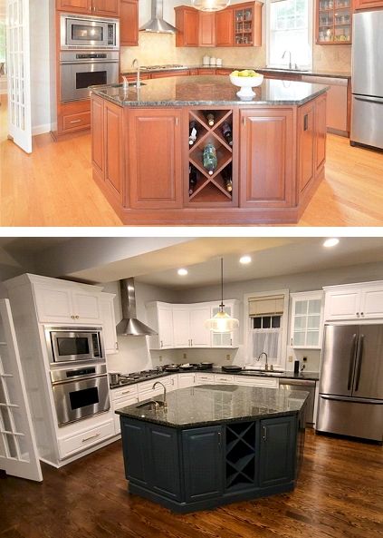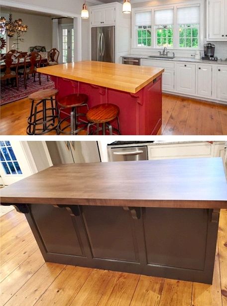 Before and After. Counter sanded to bare wood, stained with Mohawk Designer Series Kona, and sprayed with ML Campbell Polarion 2K Polyurethane Dull Sheen. Cabinet was refinished in ML Campbell Turino Conversion Varnish in Tricorn Black.