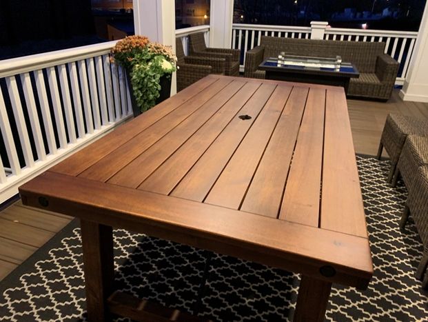 Table sanded back to bare wood, stain with Zar stain, and sprayed with ML Campbell Polarion External Polyurethane in Satin Sheen.