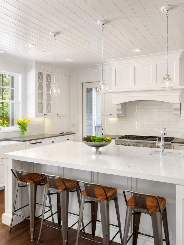 Cabinets refinished in ML Campbell Turino Conversion Varnish in Hale Navy and Chantilly Lace.